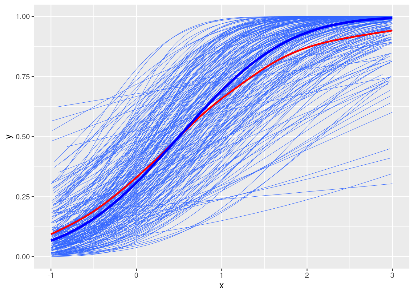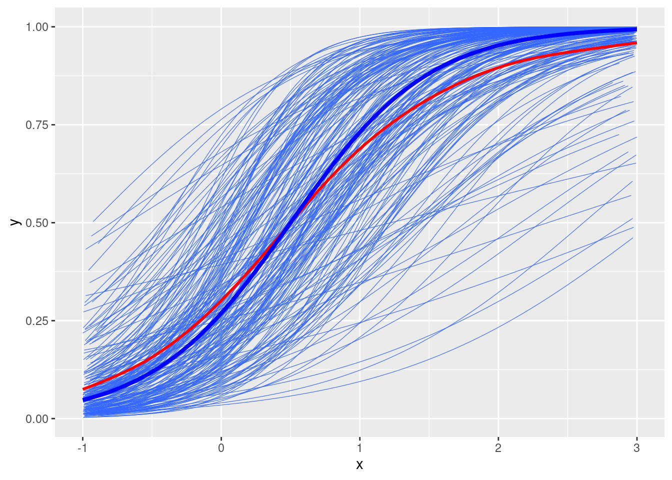 # Add random slopestau2_u1 <-0.5# u1 <- rnorm(num_subjects, mean = 0, sd = sqrt(tau2_u1))u1 <-qnorm(seq(0.01, 0.99, length.out = num_subjects), sd =sqrt(tau2_u1))# permutate the random effects to make u and u1 independentu1 <-sample(u1)# Simulate ymu2 <-plogis(gamma0 + (gamma1 + u1[subject_id]) * x + u[subject_id])# Plotdf2 <-tibble(y = mu2, x = x, id = subject_id)ggplot(df2, aes(x = x, y = y)) +geom_smooth(aes(group = id), se =FALSE, method ="glm", method.args =list(family =gaussian("logit")), size =0.2) +geom_smooth(se =FALSE, col ="red") +stat_function(fun =function(x) plogis(gamma0 + gamma1 * x), col ="blue", size =1.4)