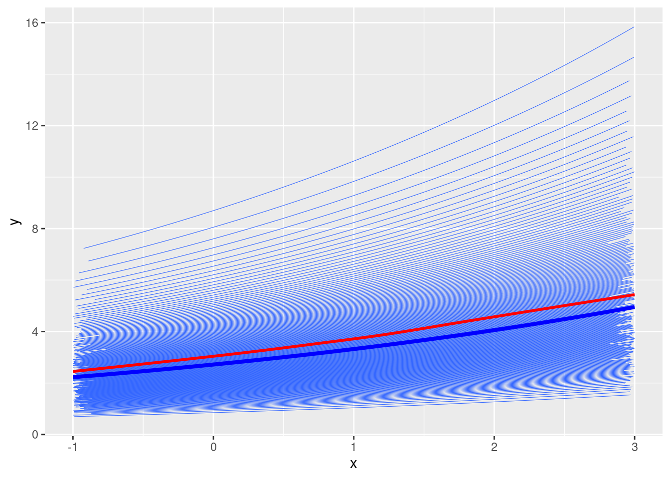 # Fixed effectsgamma0 <-1gamma1 <-0.2# Random intercepts and tau2_u <-0.25# u <- rnorm(num_subjects, mean = 0, sd = sqrt(tau2_u))u <-qnorm(seq(0.01, 0.99, length.out = num_subjects), sd =sqrt(tau2_u))# Simulate mu_{ij}mu <-exp(gamma0 + gamma1 * x + u[subject_id])# Plotdf <-tibble(y = mu, x = x, id = subject_id)ggplot(df, aes(x = x, y = y)) +geom_smooth(aes(group = id), se =FALSE, method ="glm",method.args =list(family =gaussian("log")), size =0.2) +geom_smooth(se =FALSE, col ="red") +stat_function(fun =function(x) exp(gamma0 + gamma1 * x), col ="blue", size =1.4)