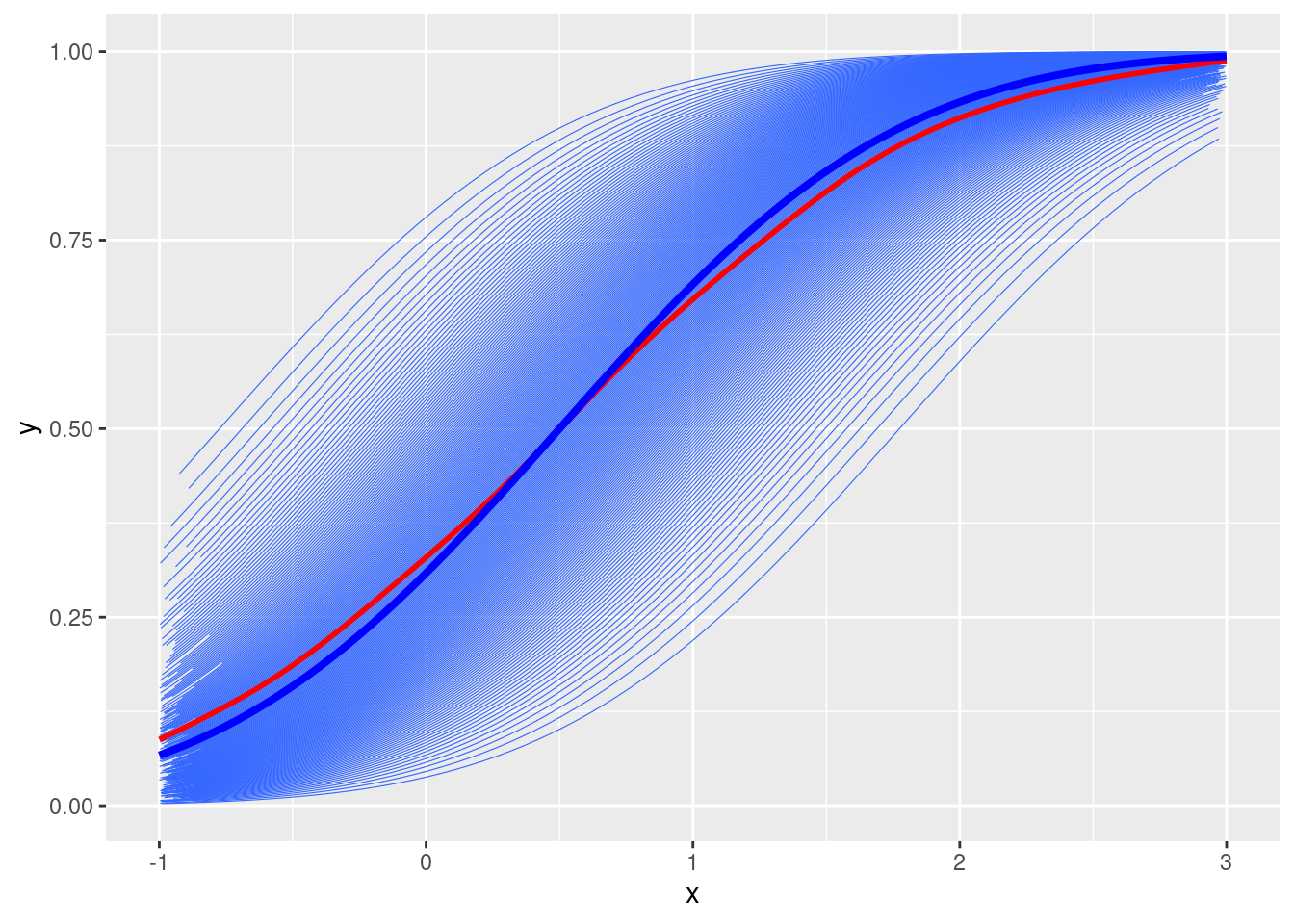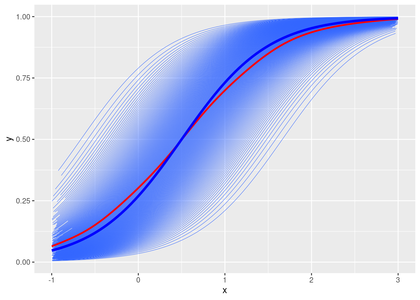 # Fixed effectsgamma0 <--1gamma1 <-2# Random intercepts and subject IDstau2_u <-1# u <- rnorm(num_subjects, mean = 0, sd = sqrt(tau2_u))u <-qnorm(seq(0.01, 0.99, length.out = num_subjects), sd =sqrt(tau2_u))# Simulate ymu <-plogis(gamma0 + gamma1 * x + u[subject_id])# Plotdf <-tibble(y = mu, x = x, id = subject_id)ggplot(df, aes(x = x, y = y)) +geom_smooth(aes(group = id), se =FALSE, method ="glm", method.args =list(family =gaussian("logit")), size =0.2) +geom_smooth(se =FALSE, col ="red") +stat_function(fun =function(x) plogis(gamma0 + gamma1 * x), col ="blue", size =1.4)