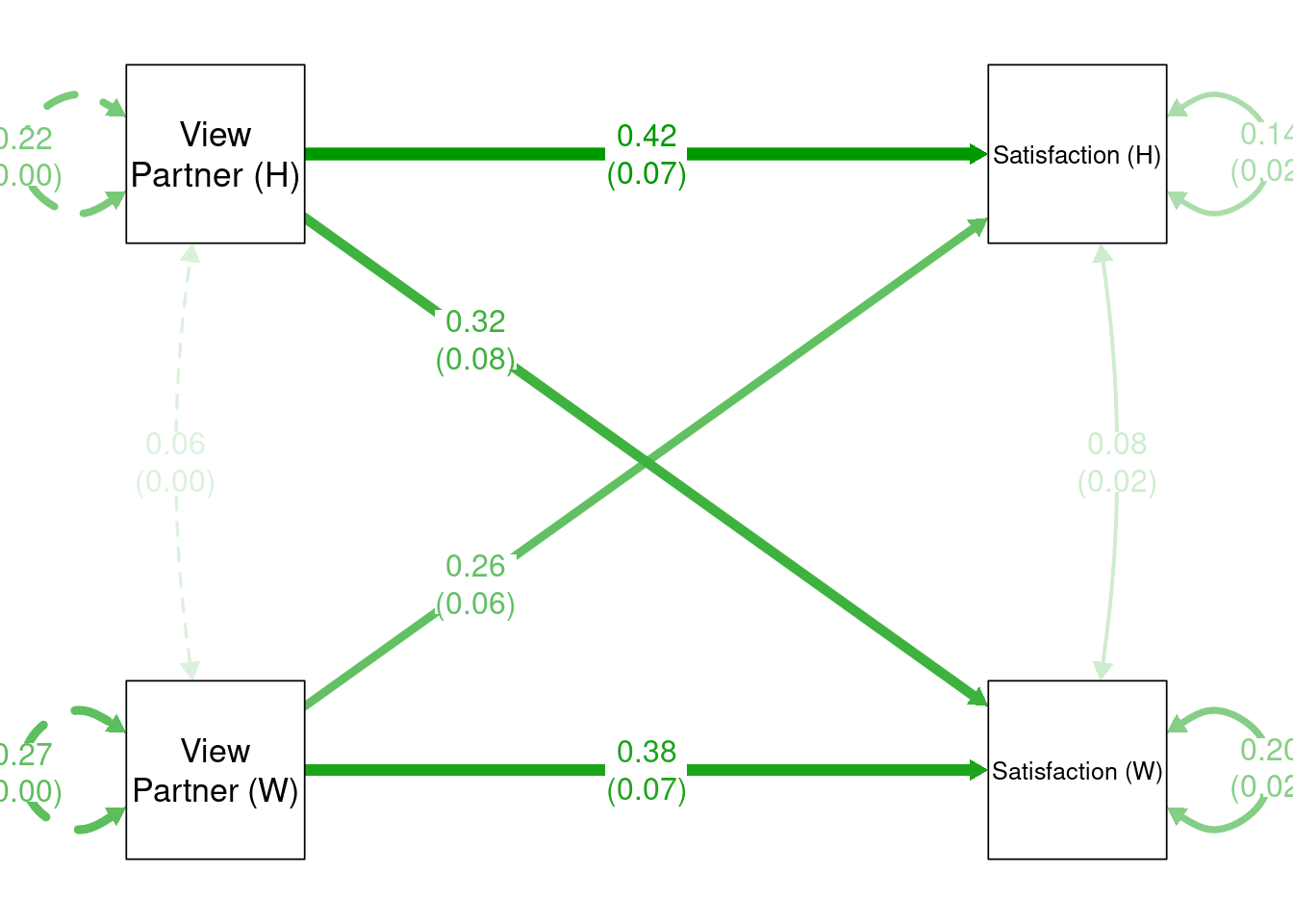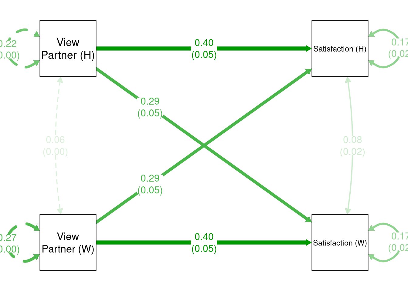 my_label_list <-list(list(node ="Satisfaction_A", to ="Satisfaction (W)"),list(node ="Satisfaction_P", to ="Satisfaction (H)"),list(node ="OtherPos_A", to ="View\nPartner (W)"),list(node ="OtherPos_P", to ="View\nPartner (H)"))p2 <-change_node_label(p1, my_label_list)p3 <-mark_se(p2, apim_fit, sep ="\n")my_position_list <-c("Satisfaction_A ~ OtherPos_P"= .25,"Satisfaction_P ~ OtherPos_A"= .25)p4 <-set_edge_label_position(p3, my_position_list)plot(p4)